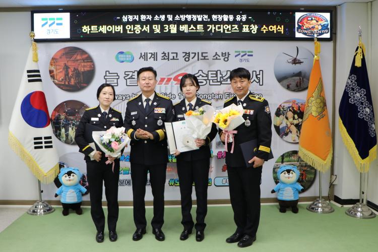 [ÆòÅÃ= ÀºÀ¯Áø ±âÀÚ] ¼Ûź¼Ò¹æ¼(¼Àå È«ÀǼ±)´Â 6ÀÏ ±¸±ÞÇöÀå¿¡¼ ½ÉÁ¤Áö ȯÀÚ¸¦ ¼Ò»ý½ÃŲ ±¸±Þ´ë¿ø°ú ¹Î°£Àο¡°Ô ÇÏÆ®¼¼À̹ö ÀÎÁõ¼¿Í µµÁö»ç ǥâÀ» Àü¼öÇϰí, ÇöÀå Ȱµ¿°ú ÇàÁ¤ ¾÷¹« Àü¹Ý¿¡¼ ¿ì¼öÇÑ ¼º°ú¸¦ °ÅµÐ Á÷¿ø¿¡°Ô ¡®º£½ºÆ®°¡µð¾ðÁî ǥ⡯À» ¼ö¿©Çß´Ù°í ¹àÇû´Ù.