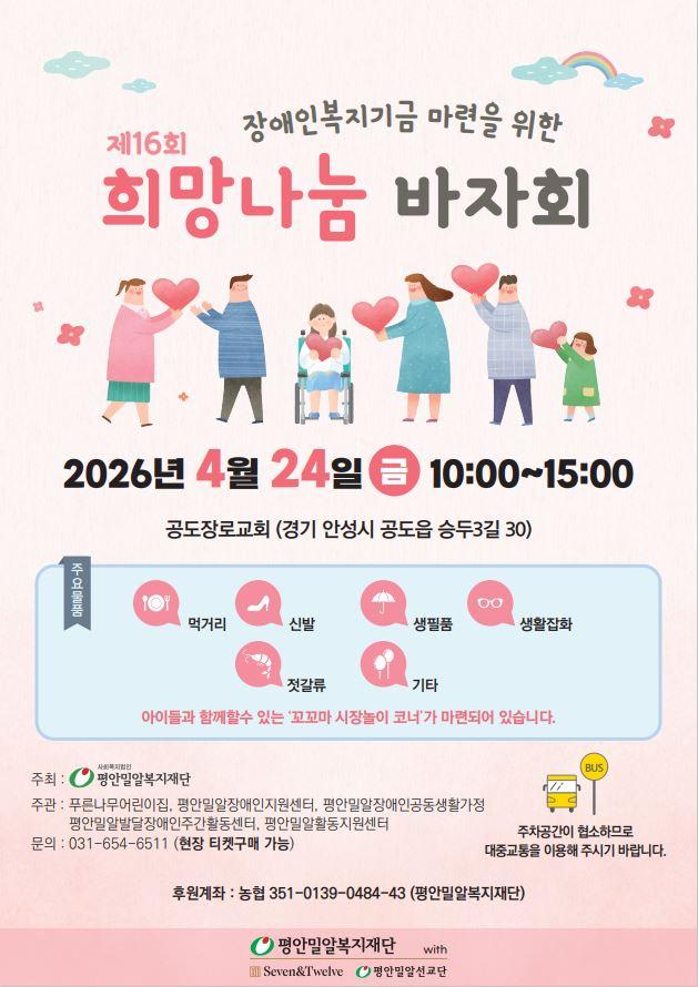 [ÆòÅÃ= ÀºÀ¯Áø ±âÀÚ] Æò¾È¹Ð¾Ëº¹ÁöÀç´Ü(´ëÇ¥ÀÌ»ç ÇÑ´öÁø ¸ñ»ç)ÀÌ ÁÖÃÖÇÏ°í »êÇÏ ±â°üÀÌ °øµ¿ ÁÖ°üÇÏ´Â ¡®Á¦16ȸ Èñ¸Á³ª´® ¹ÙÀÚȸ¡¯°¡ ¿À´Â 4¿ù 24ÀÏ(±Ý) ¿ÀÀü 10½Ã °øµµÀå·Î±³È¸(°æ±âµµ ¾È¼º½Ã °øµµÀ¾ ½ÂµÎ3±æ 30)¿¡¼ ¿¸°´Ù.