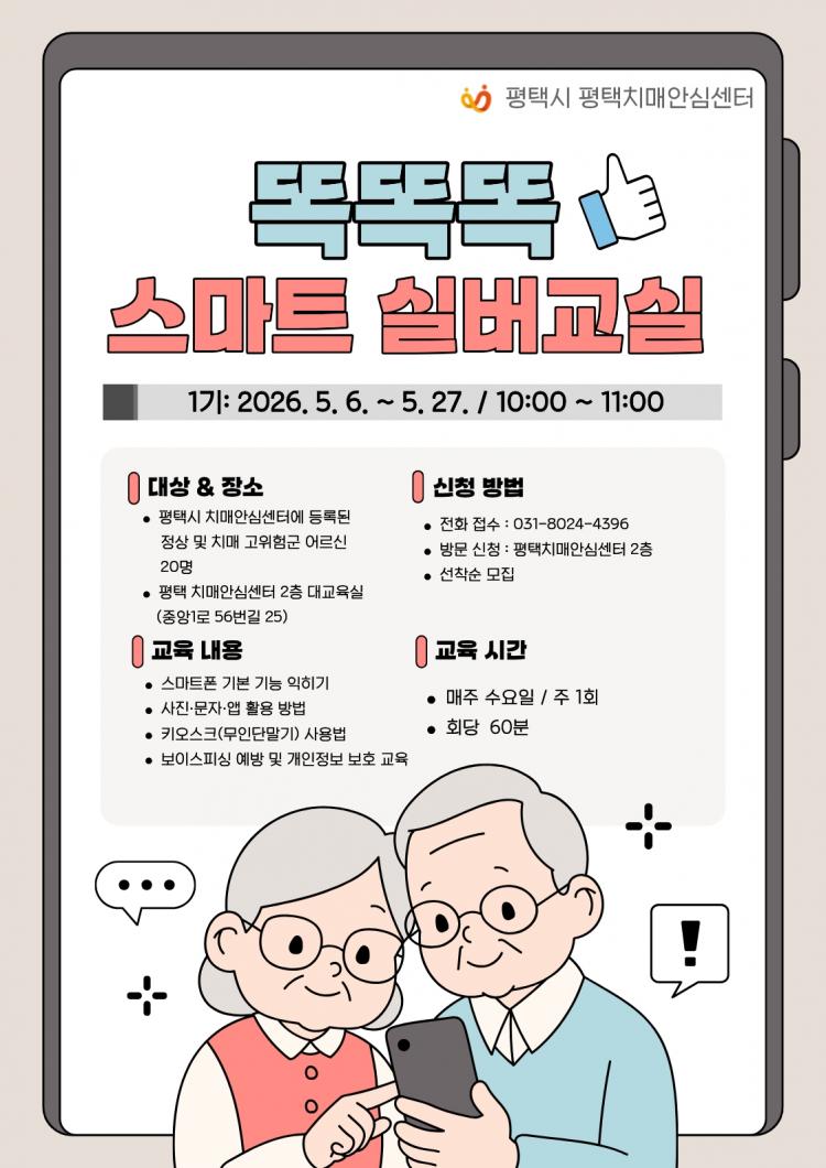 ¡®¶È¶È¶È ½º¸¶Æ® ½Ç¹ö±³½Ç¡¯Àº ÆòÅÃÄ¡¸Å¾È½É¼¾ÅÍ µî·Ï ¾î¸£½Å Áß Á¤»ó±º ¹× Ä¡¸Å °íÀ§Ç豺(ÀÎÁöÀúÇÏ, °æµµÀÎÁöÀå¾Ö)À» ´ë»óÀ¸·Î ÁøÇàµÇ¸ç, ¾î¸£½ÅµéÀÌ ½Ç»ýȰ¿¡¼ À¯¿ëÇÏ°Ô È°¿ëÇÒ ¼ö ÀÖ´Â ½º¸¶Æ® ±â±â »ç¿ë¹ýÀ» ±³À°ÇÑ´Ù.